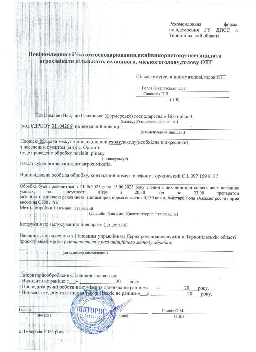 До уваги жителів с. Остап'є з 13.06 по 16. 06. 25 р. з 07.00 по 10.00 год. та з 20.30 по 23.00. СФГ " Вікторія" будуть проводити роботи з обробки посівів із застосуванням пестицидів та агрохімікатів.