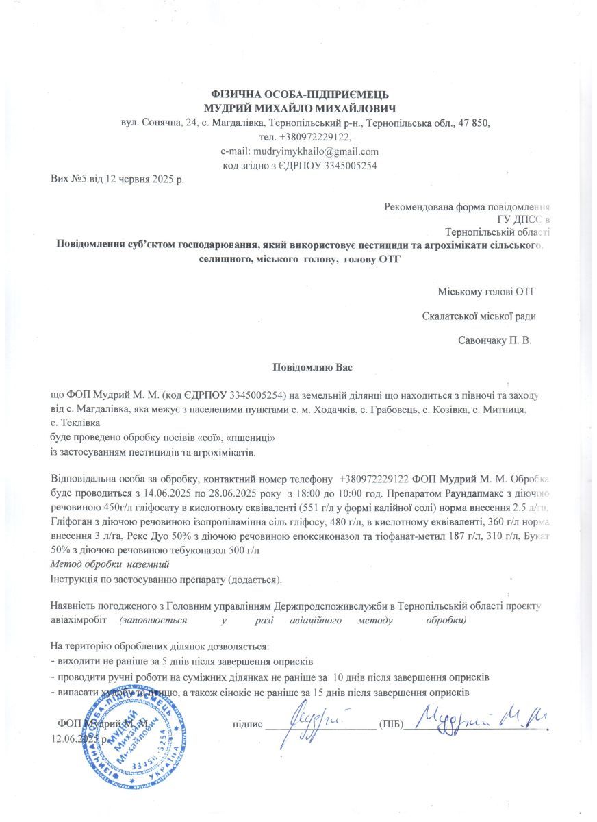 До уваги жителів с. Теклівка, с. Митниця з 14.06 по 28.06.25р. (18:00 год.-10:00 год.) ФОП Мудрий М. М. будуть проводити роботи з обробки посівів із застосуванням пестицидів та агрохімікатів.