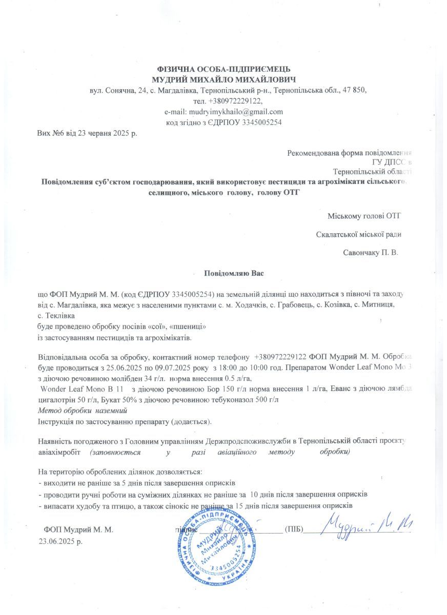 До уваги жителів с. Теклівка, с. Митниця з 25.06 р. по 09.07.25 р. (18:00 год.-10:00 год.) ФОП Мудрий М. М. будуть проводити роботи з обробки посівів із застосуванням пестицидів та агрохімікатів.