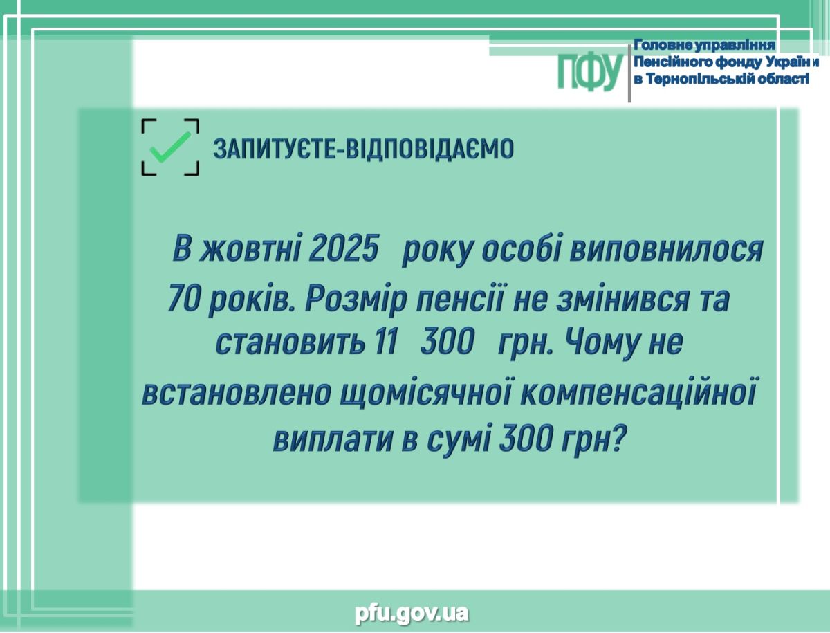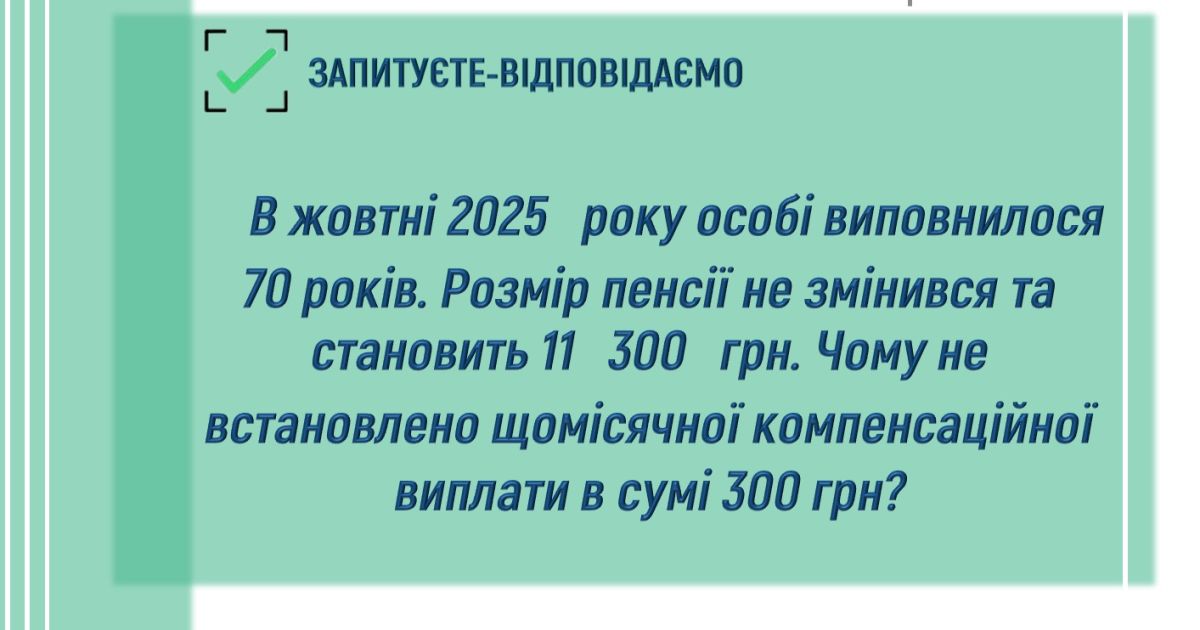 В жовтні 2025 року особі виповнилося 70 років. Розмір пенсії не змінився та становить 11 300 грн. Чому не встановлено щомісячної компенсаційної виплати в сумі 300 грн?