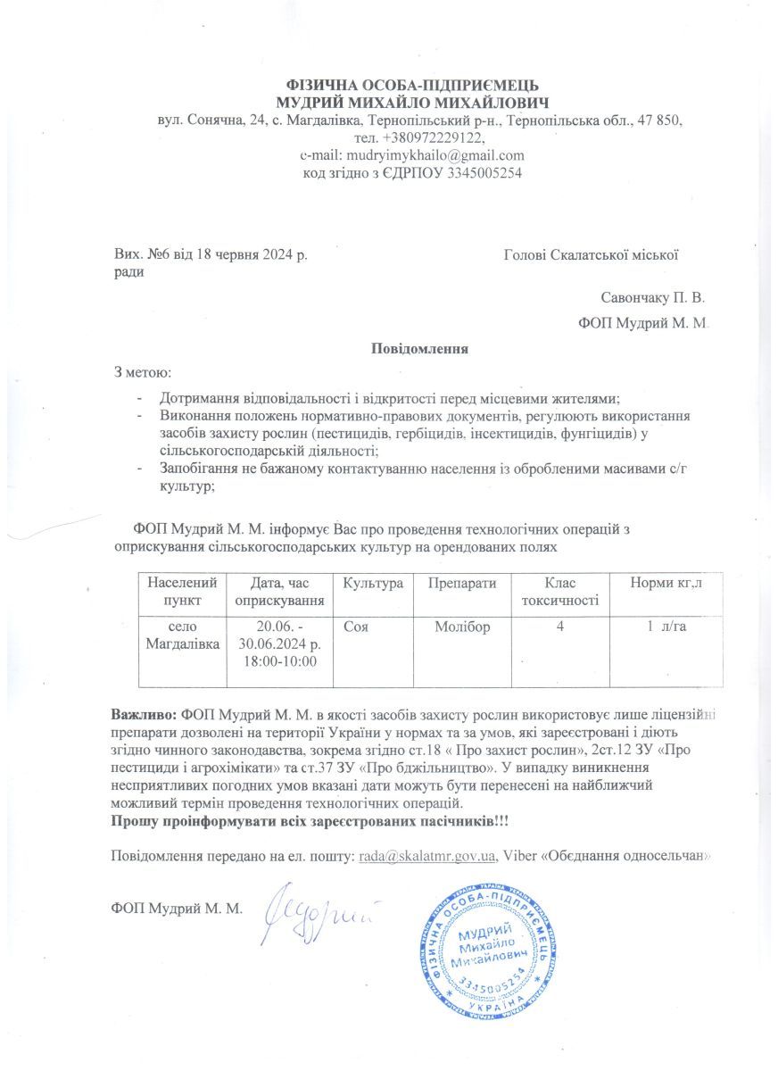 Повідомлення про застосування засобів захисту рослин з 20.06.2024 по 30.06.2024 року