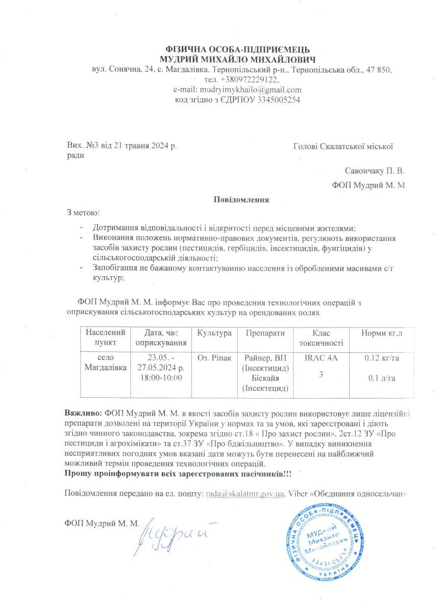 Повідомлення про застосування засобів захисту рослин з 23.05.2024 по 27.05.2024 року