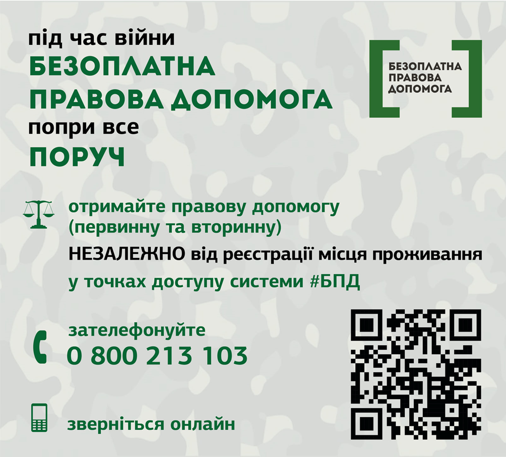 Нагадуємо, що ведення воєнного стану не призводить до обмежень прав людей на безоплатну правову допомогу, гарантованих Законом України «Про безоплатну правову допомогу». Звернутися за безоплатною правовою допомогою можна до найближчого бюро правової допомоги, незалежно від реєстрації місця проживання.
