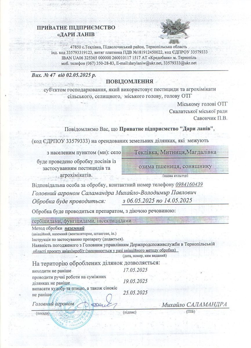 До уваги жителів с. Теклівка, с. Митниця, с. Магдалівка. У вівторок 06.05.2025 і до середи 14.05.2025 року фермерським господарством "Дари ланів" будуть проводитися роботи з обробки посівів із застосуванням пестицидів та агрохімікатів.