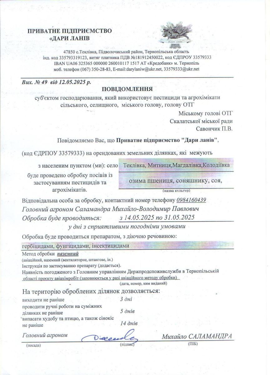 До уваги жителів с. Теклівка, с. Митниця, с. Магдалівка, с. Колодіївка. У середу 14.05.2025 і до суботи 31.05.2025 року фермерським господарством "Дари ланів" будуть проводитися роботи з обробки посівів із застосуванням пестицидів та агрохімікатів.