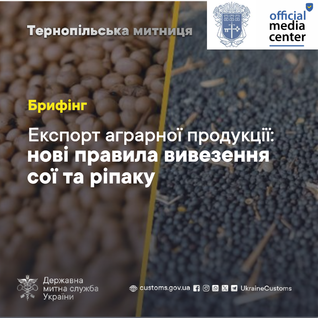 У вівторок, 28 жовтня, о 10:00 год. у медіацентрі Тернопільської обласної військової адміністрації відбудеться брифінг на тему: «Експорт аграрної продукції: нові правила вивезення сої та ріпаку» за участю начальника управління контролю та адміністрування митних платежів Тернопільської митниці Олександра Брюховецького.